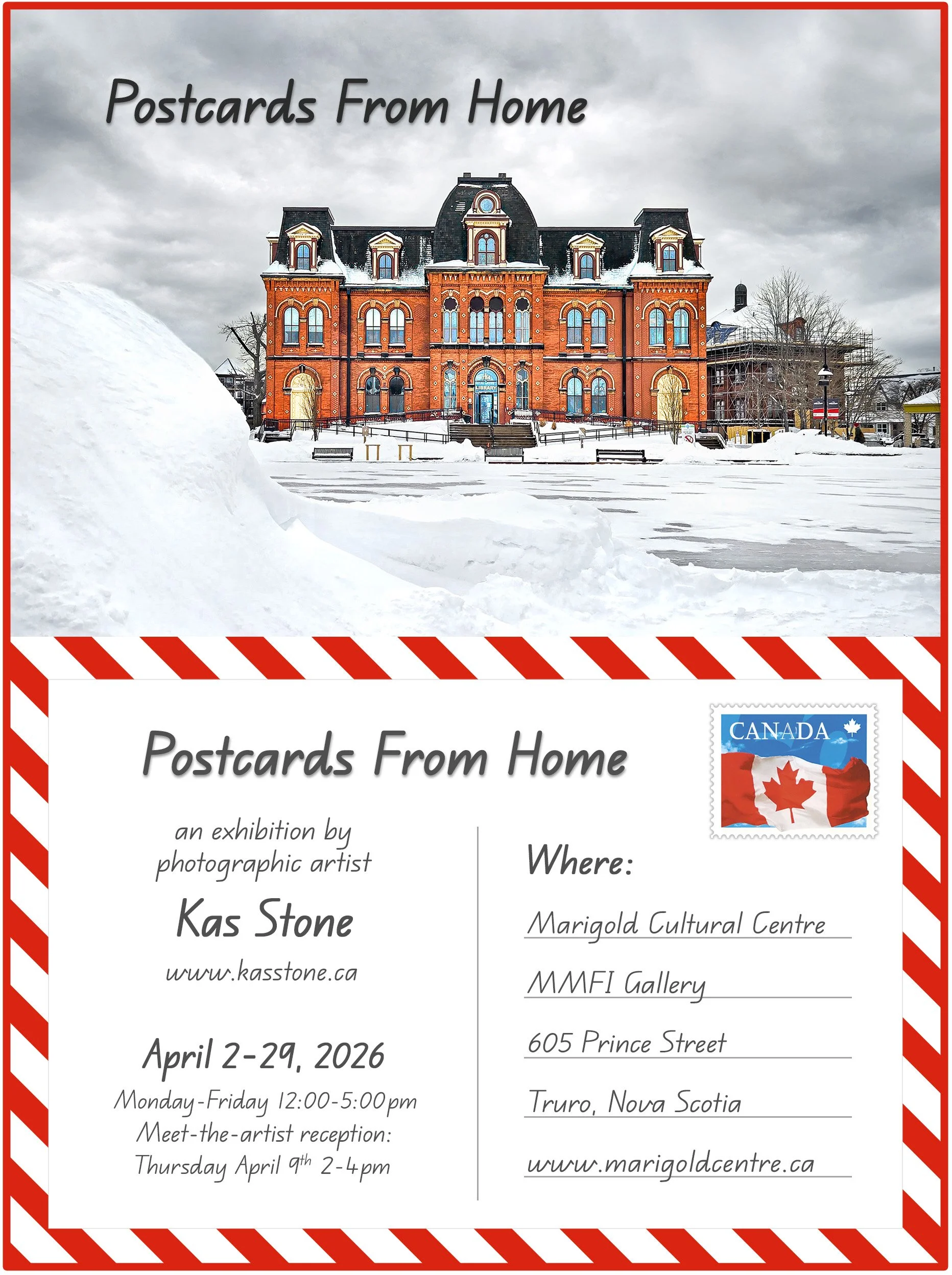 Marigold Cultural Centre MMFI Gallery, “Postcards From Home” solo exhibition, Truro NS, April 2-29 2026 with a meet-the-artist reception Thursday April 9 from 2-4pm, free admission, info HERE.